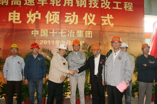 920上午918分,伴随着喜庆的音乐和鞭炮声,马钢高速车轮用钢技术改造工程电炉倾动仪式隆重举行。马钢集团公司董事长顾建国、副总经理高海建、中国十七冶集团总经理喻世功、总经理助理王青山出席了仪式,马钢各参建公司领导、康卡斯特公司马钢电炉项目现场经理古斯塔瓦、马钢电炉厂领导和员工代表以及十七冶马钢项目部员工代表近150人参加了仪式。