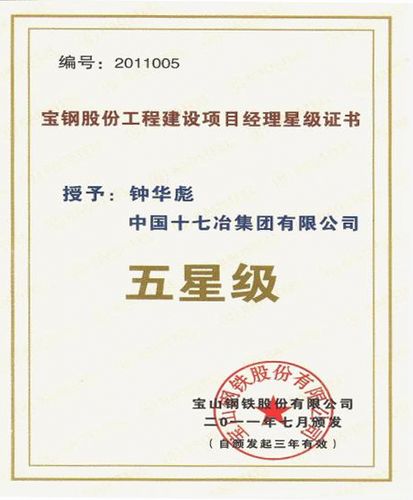 此次研讨会中所有受邀参会单位仅有7人获此殊荣。此项荣誉的获得,不仅是宝钢对钟华彪同志个人工作的肯定,更是对十七冶近年来施工管理水平和综合实力的认可。按宝钢股份公司的规定,今后担任宝钢工程的项目经理必须具备相应的星级标准,此项荣誉的获得将为公司开拓宝钢建设市场带来积极影响。