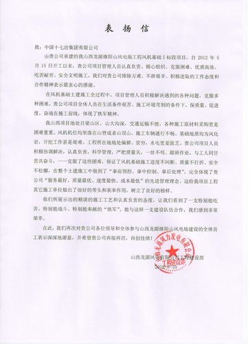 810,山西龙源风电有限公司工程建设部致信中国十七冶集团,表扬我公司山西龙源继阳山风电项目部全体员工在风机基础施工中克服各种困难,优质高效地提前完成施工任务,并对此表示衷心感谢。
