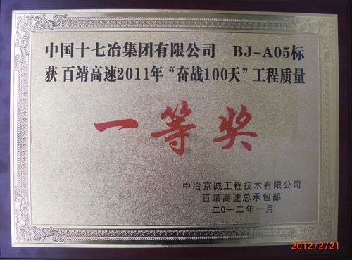 220下午,在广西百靖高速公路业主举办的“奋战100天”劳动竞赛总结表彰大会上,十七冶路桥工程技术公司广西百靖高速公路BJ--A05标在全线22个标段工程质量评比中获“一等奖”。