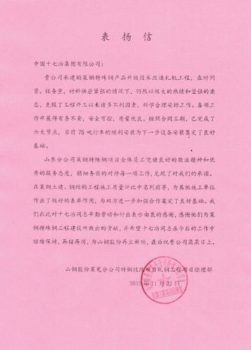 日前,山钢股份莱芜分公司特钢技改项目轧机工程项目经理部致信中国十七冶集团,表扬我山东分公司莱钢特殊钢轧机工程项目经理部全体员工在施工中克服各种困难,优质高效的完成六大节点施工任务,并对此表示衷心的感谢。