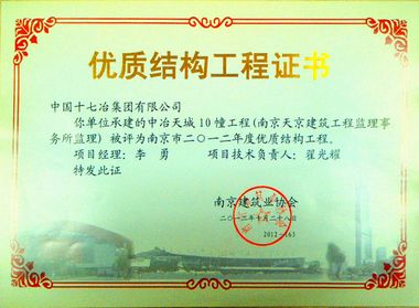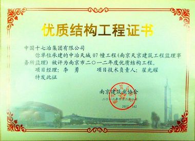 日前,由中国十七冶集团南京分公司承建的南京中冶天城项目07幢、10幢工程被评为“南京市2012年度优质结构工程”,这也是该项目自获得江苏省文明工地后获得的又一项殊荣。
