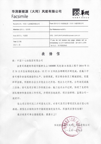 日前,华润新能源(大同)风能有限公司致信中国十七冶集团,感谢风力与太阳能发电工程技术公司承建施工的华润天镇神头山100MW风电场A标段工程顺利实现并网发电,表扬公司领导亲临施工现场调度指挥,项目部全体员工精诚团结、与协作队伍通力合作,急业主所急,想业主所想,以客户满意为荣,以快速、高效、优质地出色完成了施工任务。
