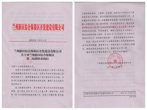 日前,兰州新区综合保税区开发建设有限公司向中国十七冶集团发来表扬信,表扬甘肃分公司在承建兰州新区综合保税区第三标段工程过程中在进度管理、质量控制、安全文明施工等方面取得的良好业绩;感谢公司领导多次亲临施工现场调度指挥;赞扬项目部全体员工本着精诚团结、通力合作,急业主所急、想业主所想的精神,“快速、高效、优质”地完成了各项阶段性任务。