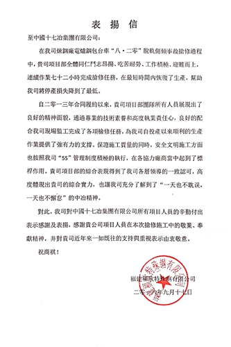 9月17日,福建福欣特殊钢有限公司向中国十七冶集团发来表扬信,对冶金工程技术分公司福欣特钢炼钢连铸厂、退酸厂长期维保工程项目管理团队在“八·二零”电炉钢包台车脱轨侧倾抢修过程中连续72小时抢修作业进行表扬。