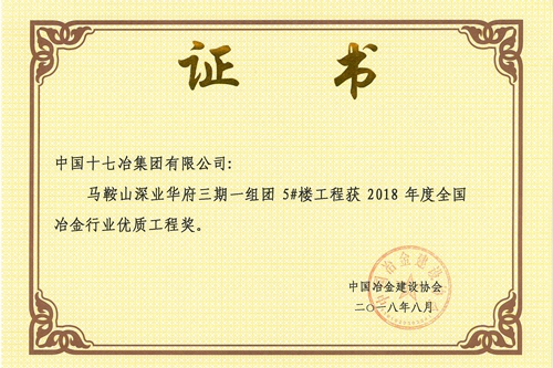 8月20日中国十七冶集团收到中国冶金建设协会寄来的获奖证书公司承建的9项工程荣获2018年度全国冶金行业优质工程奖。