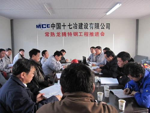 118,常熟龙腾特钢项目部在现场召开工程推进会。公司总经理助理王青山,项目监管部,机电公司及相关部门负责人和各建设单位的主要领导参加了会议。