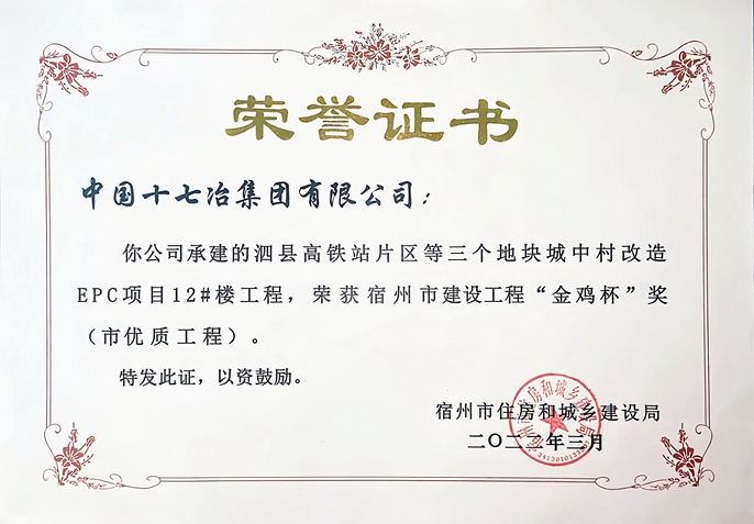 3月30日,宿州市住建委向2021年度宿州市建设工程“金鸡杯”工程获奖单位颁发荣誉证书,中国十七冶承建的泗县高铁站片区等三个地块城中村改造EPC项目和泗县城市综合管理中心项目位列其中。