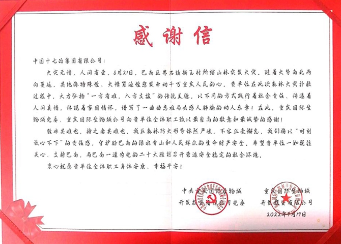 重庆国际生物城公司向十七冶致感谢信