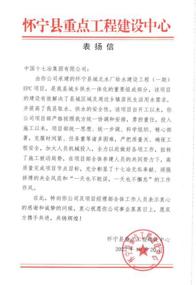 10月31日,中国十七冶集团收到怀宁县重点工程建设中心发来的感谢信,对管廊分公司承建的怀宁县城北水厂给水建设工程(一期)EPC项目优质高效的完成项目节点目标表示感谢。
