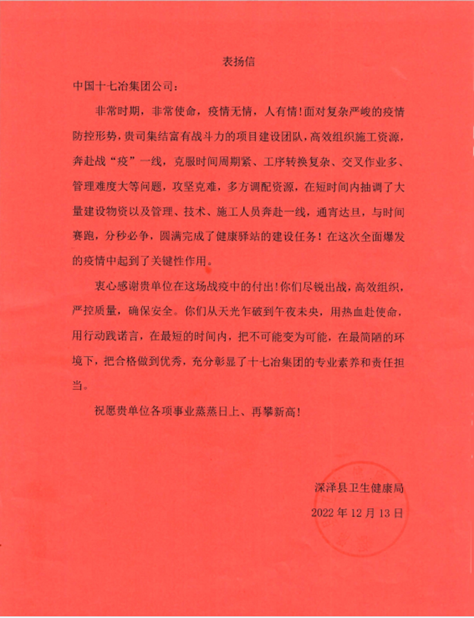 12月13日,中国十七冶集团收到河北省深泽县卫生健康局表扬信,对中国十七冶集团建安分公司深泽健康驿站项目部高效完成建设任务、助力属地疫情防控致以衷心的感谢。