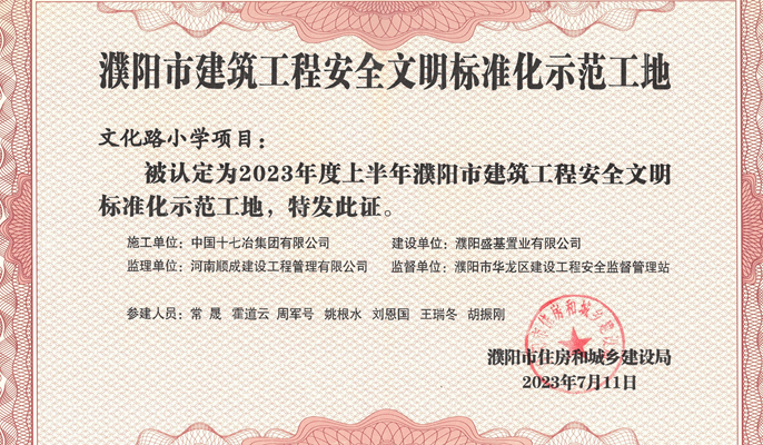 近日,从濮阳市住房和城乡建设局获悉,中国十七冶冶金分公司承建的濮阳华龙区文化路小学项目荣获“濮阳市建筑工程安全文明标准化示范工地”称号。