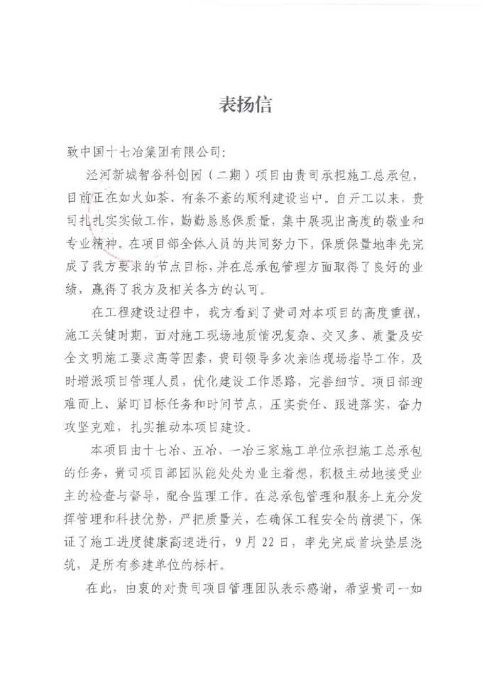 泾河新城城市建设投资公司向十七冶致表扬信