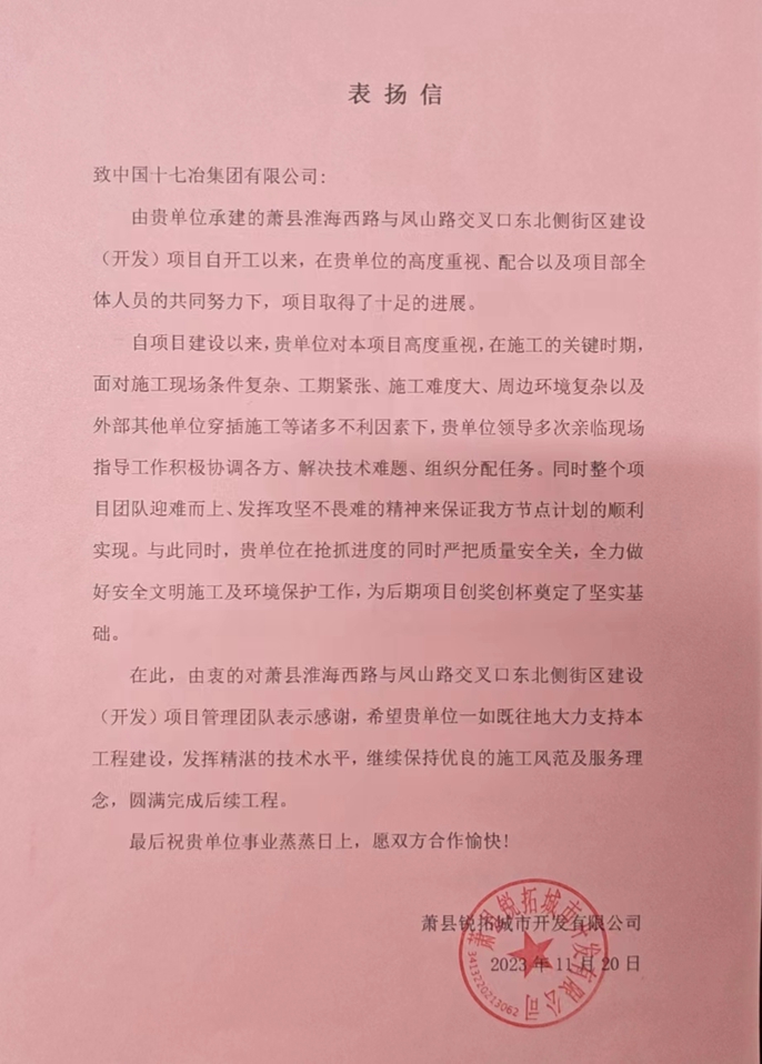 近日,萧县锐拓城市开发有限公司向中国十七冶集团致表扬信,对南京分公司萧县淮海凤山侧街区建设项目团队发挥精湛技术水平,保持优良施工风范,高效推进项目建设提出表扬。