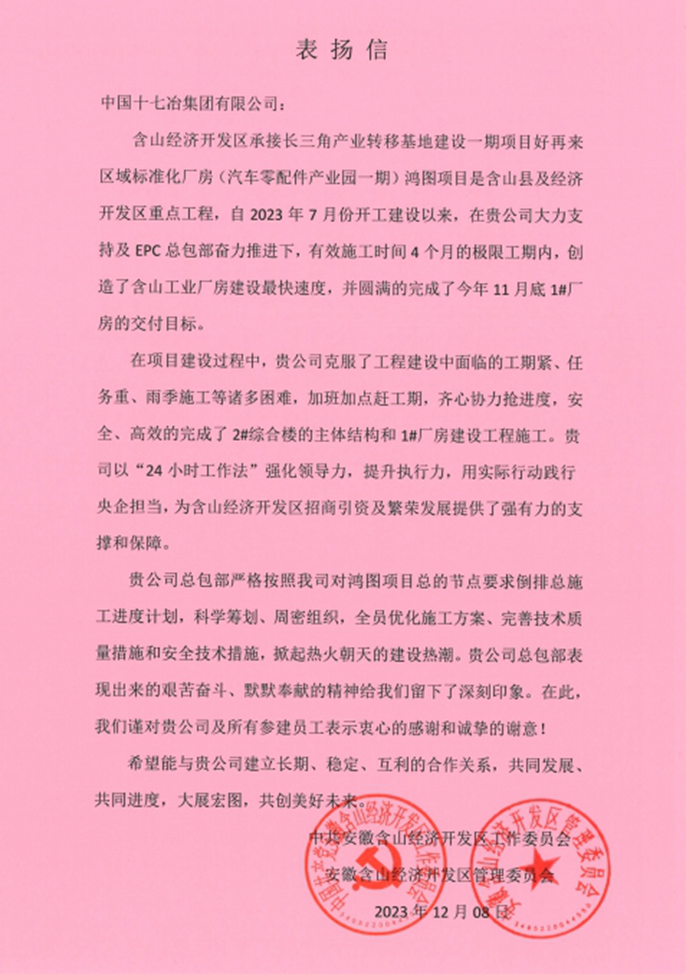 含山经开区工委会、管委会向中国十七冶致表扬信