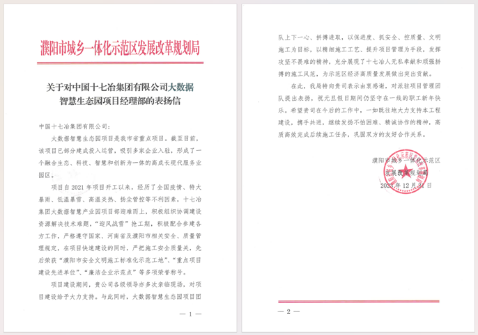 近日,濮阳市城乡一体化示范区发展改革规划局向中国十七冶集团致表扬信,对冶金分公司大数据智慧生态园项目高质量完成年度建设任务表示感谢。