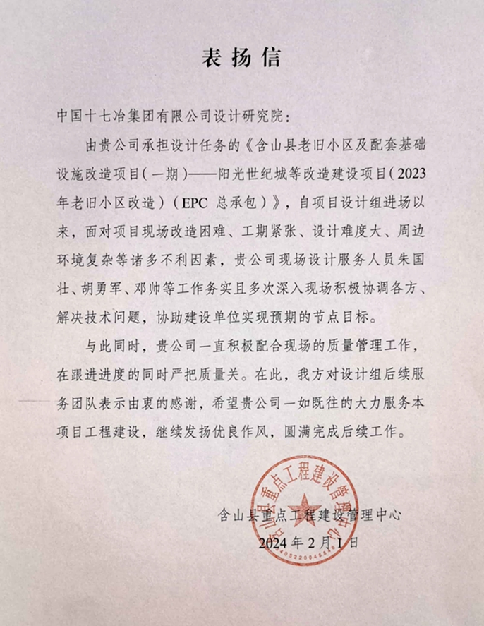 近日,含山县重点工程建设管理中心向中国十七冶设计研究院致表扬信,对设计研究院在含山县2023年老旧改造(一期)项目阳光世纪城等工程中提供的优质设计服务提出表扬。