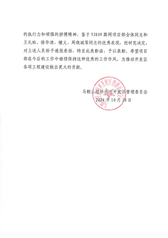 10月28日,马鞍山经开区管委会向中国十七冶致表彰函,对经开区银塘单元路网项目真抓实干,积极对接经开区入驻企业需求,按期保质完成明珠路雨污水管道施工任务,确保企业投产、管线投用致以感谢。