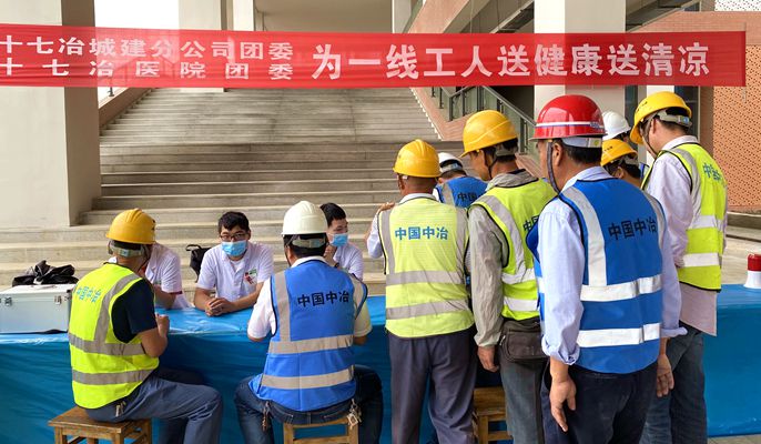 6月18日上午,十七冶安徽工程大学项目部联合十七冶城建分公司团委、十七冶医院组织开展为一线工人“送健康、送清凉”慰问活动,向作业工人发放西瓜、矿泉水、防暑香囊等防暑降温物品,为他们送去清凉和关怀。