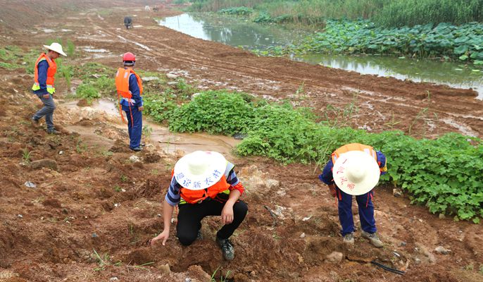 7月28日下午一点,留守在铜城闸巡堤的吴跃明与陈志,在巡查时发现黄墩大桥至铜城闸堤岸旁一处不起眼的地方,湿润的泥土地里有一股水流正在往农田地里渗漏,水量逐渐岀现变化,立即上报当地防汛指挥所,并开展抢险工作——用铁锹铲土,压实渗漏点。后经水利专家确认无风险,排除此处安全隐患。