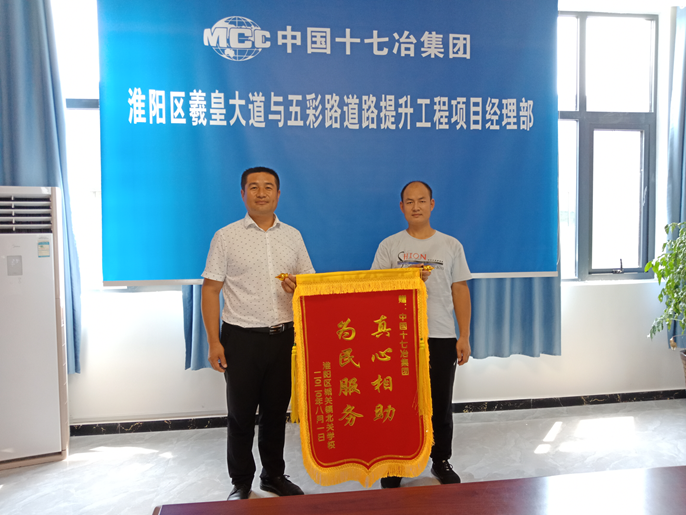 8月5日上午,河南省周口市淮阳区城关镇北关学校给中国十七冶集团交通工程技术分公司河南周口市淮阳区羲皇大道与五彩路道路提升工程项目部送来一面“真心相助,为民服务”的锦旗,表达对项目部采取安全防护措施,保证学生安全出行的感激之情。