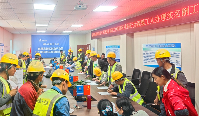 4月20日,中国十七冶山东分公司东营高新区创业产业园项目部联合当地中国农业银行,将银行业务从网点搬到工资,为项目百余名工友免费办理工资卡。